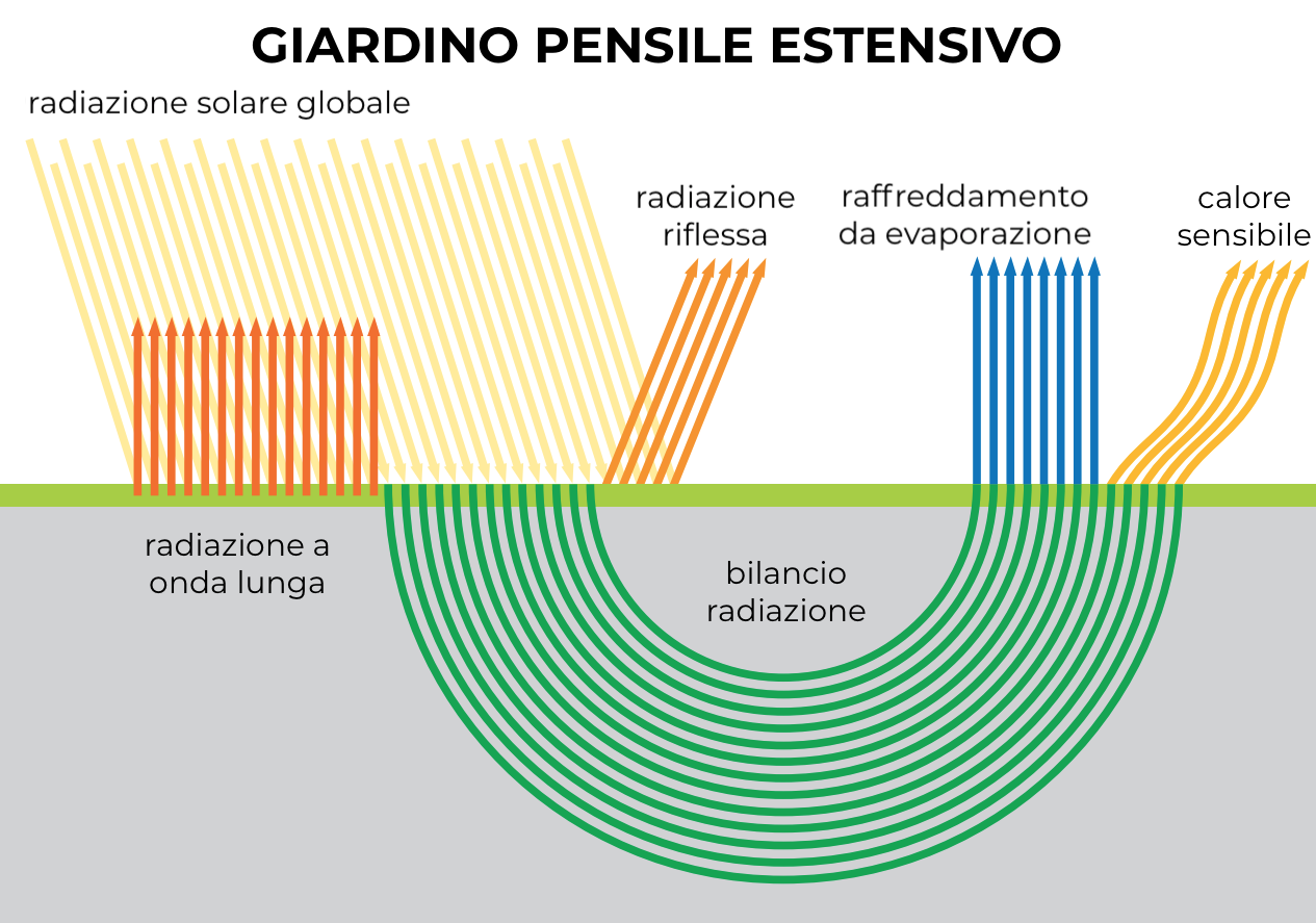 Su un Giardino Pensile, invece, una frazione considerevole di energia viene immagazzinata dal substrato creato (nuovo suolo) e successivamente utilizzata dalle Piante per evaporare acqua usando Calore Latente (evapotraspirazione).
