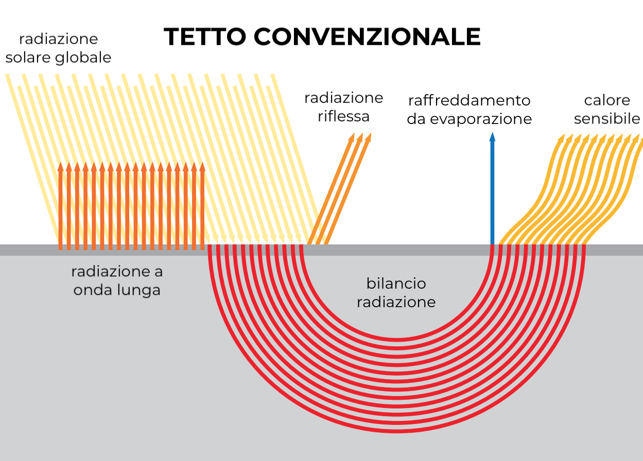 Sui tetti convenzionali, l’energia solare assorbita è sostanzialmente rilasciata sotto forma di Calore Sensibile e Radiazioni Termiche.